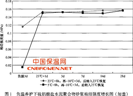 先放人常温23 OC养护8h,负温-IOoC养护3d后的强度为0.116MPa,能达到国家标准值;若成型后先放人低温5℃养护8h再负温3d养护,强度仅为0.015MPa。但转入23℃正温恢复后两种情况下的试件恢复强度和恢复规律基本一致,即23℃恢复1 d,试件粘结强度分别为0.153MP和0.15MPa,远远超过国家标准值,龄期28d时,粘结强度达到0.156MPa左右,且聚苯板界面完全破坏。