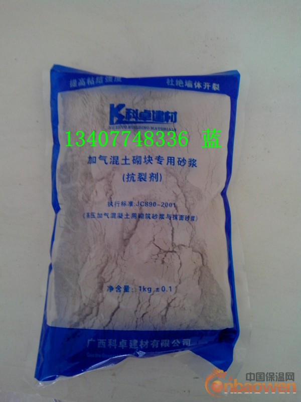 科卓(13407748336蓝先生) 加气砖专用砂浆(抗裂剂),由矿物蓄水填料、保水剂、粘结剂和抗裂剂等聚合物组成。按比裂掺入普通混合砂浆中,成为加气砖等轻质砌块的专用砌筑砂浆和抹面抗裂砂浆。其性能超过成品专用砂浆,造价仅为成品专用砂浆的30%。它具有良好的和易性、保水性、抗裂性和低收缩率,能防止砂浆上墙后失水过快,增强砂浆与砌体的粘结力,有效防止墙壁体开裂、抹灰层空鼓、脱落等。添加该产品,砌筑砂浆厚度从原来的20mm可降至6mm,同时也可以降低抹灰层的厚度,降低墙体荷载,减少材料损耗,具有良好的综合效益。
