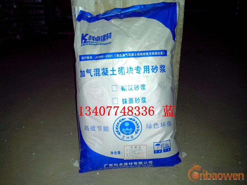 “科卓” (13407748336蓝 先生)电子商务:蓝 加气混凝土砌块专砂浆是吸收国内先进技术开发的高新科技产品,是用优质水泥以及多种外加剂配制而成的新型多功能聚合物改性水泥基复合材料。它从根本上解决了长期存在的建筑墙体渗漏、开裂等问题,特别是解决了加气混凝土、轻质砌块等新型砌材因吸水率大而引起界面粘结不牢,建筑墙面抹灰粘附强度低,抹灰层出现空鼓、开裂以及产生渗漏等弊端。