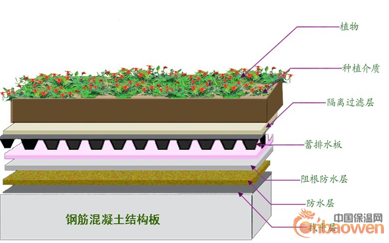 3、保温层:宜选用聚苯乙烯泡沫塑料板、聚乙烯泡沫塑料板以及现场喷涂硬质发泡聚氨酯做保温层。种植土厚度大于800mm时,可补设保温层。