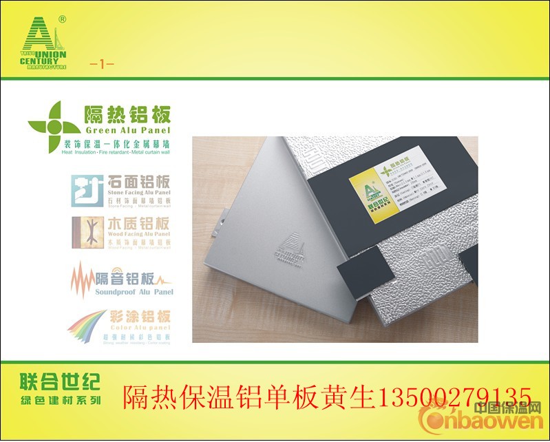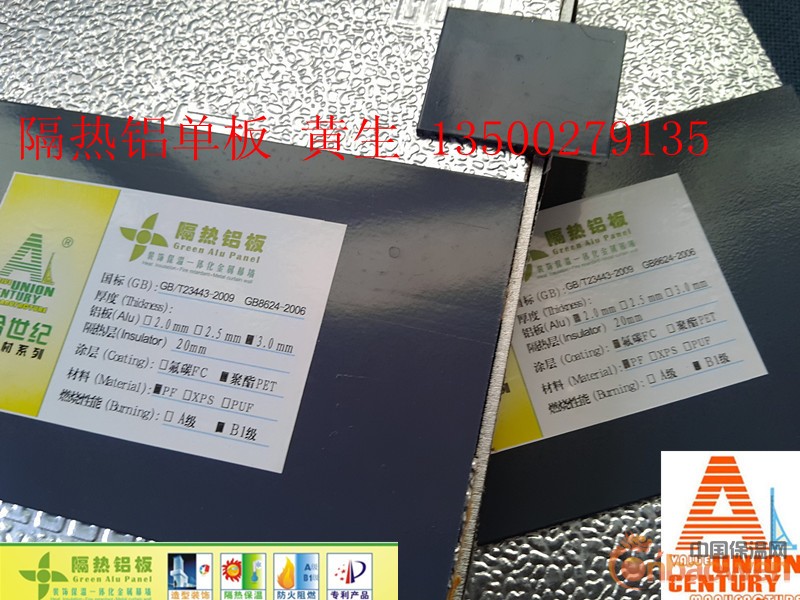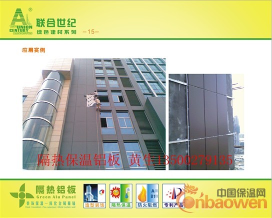 联合世纪隔热铝板由于固定保温材料的方式独特简便,所以用户可以在安装铝板前临时决定加装保温材料,加装保温材料的工序可以在工厂内完成,也可以在施工现场完成。用户可以根据消防和造价的不同要求,自由选择特种改性酚醛板聚苯乙板、阻燃挤塑苯板、阻燃硬聚氨酯、阻燃橡塑保温板等燃烧性能为A级或B1级的有机保温材料。