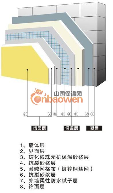 KY-3型保温砂浆、界面砂浆、聚合物抗裂砂浆、耐碱网格布等材料按施工工艺,逐步在基层上施工,从而构成KY-3型无极玻化微珠保温砂浆系统。该系统确立了外墙外保温各构造层,柔韧变形量逐层渐变释放应力的抗裂技术路线,解决了外墙保温面层容易出现裂缝的关键难题,确立了外墙保温无空腔体系作法,减少了风压特别是负风压对高层建筑保温建筑保温层的破坏等技术特点。