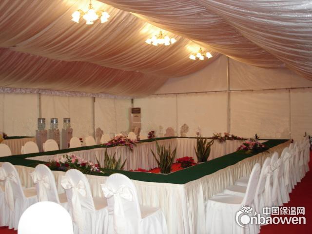 1):顶布和围布主要采用经过双表图层处理,高强度1000D涤纶长丝制作的PVC刀刮布。2):篷布主要功能有防水、防火、防紫外线,带自洁功能。3):防火等级:B1级(相当于德国的M2)(难燃,离火三秒自灭)具有相关证书。4):篷房规格主要有:580g/m2 、660g/m2 、750g/m2 、850g/m2 、900g/m2 、等等。