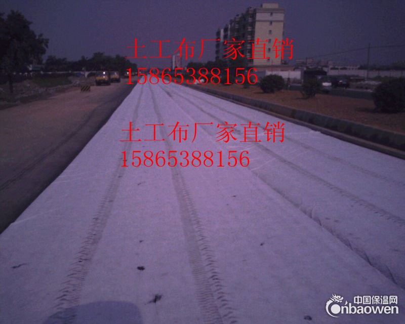 2、 碾压完毕后要及时铺设土工布,固这时基层水份还未干,铺设时要按施工技术人员所放边桩进行控制铺设位置,技术人员所放边桩距土工布边30cm每25米1个边桩,铺设时先把土工布打开,土工布100米为一卷,土工布拉开后用4人拉直,按边桩用钢尺把两边尺寸先放对,然后按控制桩把中间土工布调直,调直完毕后用土把土工布四周盖一下,以免被风吹起。