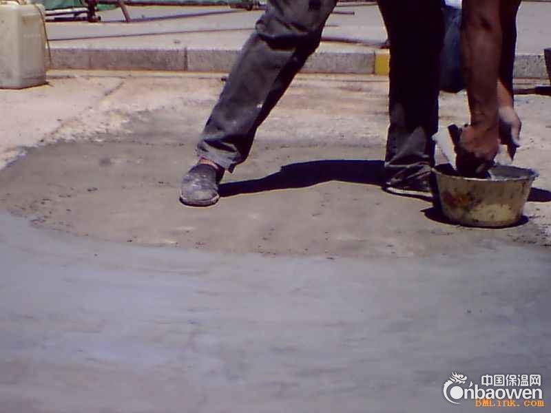 在已凿毛和干净湿润的基层上,用刷子均匀刷一道稀粘状的水泥防水剂素浆(配合比为水泥:水:无机铝盐防水剂 =1 : 2.20 : 0.08 )作结合层。以提高防水砂浆与基层的粘合力。厚度以 2 ㎜左右为宜。
