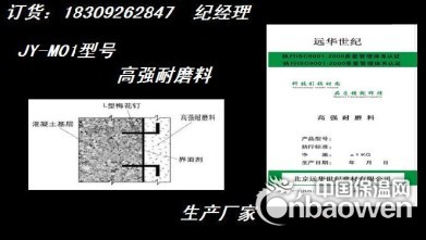 高强耐磨料一种水泥基复合单组分干粉砂浆,由高强水泥、矿物质掺合料、高强度骨料以及抗裂耐磨剂,经工业化生产配制而成。该高强耐磨料现场加水搅拌即可使用,施工和易性好,通过人工抹灰在料仓或矿槽表面形成一定厚度的抗磨层,经过正常养护即可达到技术要求,具有耐磨性高,与基础混凝土(钢筒仓)的粘接强度高,抗冲击性强,抗压强度高,耐久性好、使用期限长等特点。高强耐磨料专用于冶金、煤炭、火电、化工、水泥等行业的冲渣沟、矿槽、卸煤槽、下料斗、料筒仓的内衬抗磨层和水利水电、港口码头等工程的泄洪闸、卸料斗的抗磨层,起到保护基础混凝土(或钢筒仓)的作用。