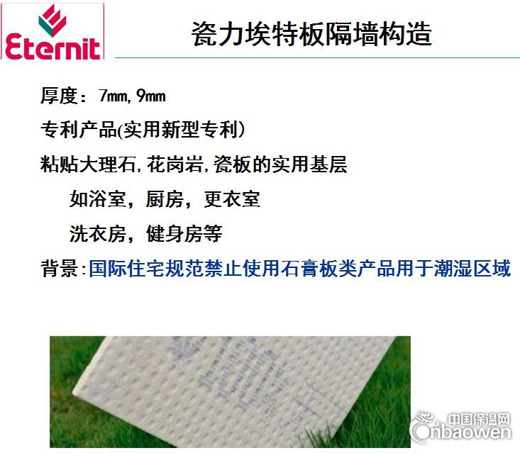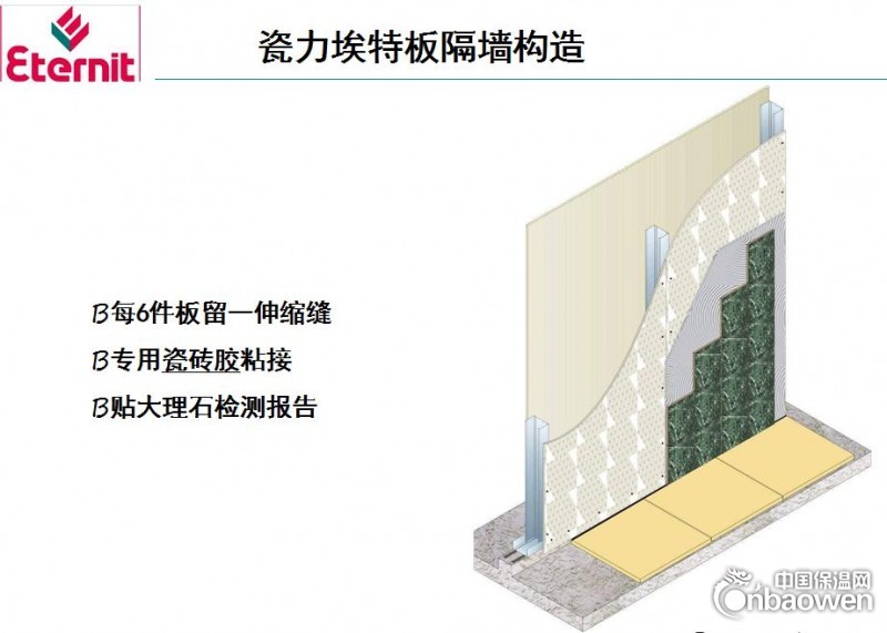 瓷砖可通过瓷砖胶直接粘贴于瓷力埃特板上。板材与轻钢龙骨组成隔墙的基材。瓷力埃特板隔墙的构造与普通的轻钢龙骨隔墙不同。面砖的重量较大时墙体需加强。当墙体上需要粘贴较重的石材时,可选用9mm瓷力埃特板并参考《埃特板隔墙技术手册》安装。