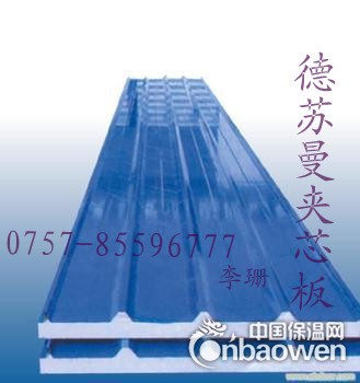 德苏曼EPS隔热夹芯板是以彩色涂层钢板为面材,自熄聚苯乙烯为芯材,用热固化胶在连续成型机内加热加压复合而成的超轻建筑板材。具有自重轻(为混凝土屋面重量1/20~1/30),保温隔热(其导热系数值为0.034w/mk),施工速度快(无温作业,不作二次装修)的特点,是一种集承重、保温、防水、装修于一体的新型围护结构材料。