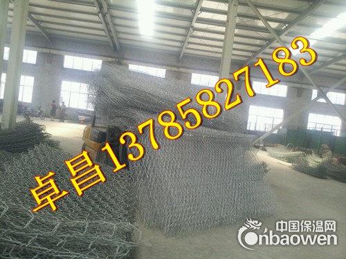 格宾网的生产:格宾网由优质低碳钢丝经机器拧编成六角形网孔的网片,再由工人将网片组装成各种尺寸的网箱。