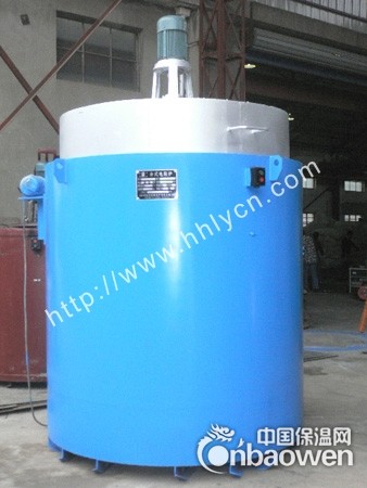 本炉由角钢、槽钢、钢板经焊接成圆柱形外壳,外壳内采用轻质粘土砖作耐火层,砌筑成竖井式炉膛,加热元件安置在炉膛内壁的搁砖上,在炉膛外圈,包一层硅酸铝耐火纤维作为隔热层,隔热层与外壳之间用保温粉、硅藻土匪砖填实作保温层,炉膛中间有一圆筒形装料筐,将加工的机件放入装料筐内进行加热,为了保证装料筐在吊入和取出时的安全,在加热元件和装料筐之间设有一层保护筐,炉顶有一通风机,作为在加热过程中搅拌炉膛内的空气,从而使炉膛内的温度尽量均匀,在开启炉盖之前,均须切断电源。