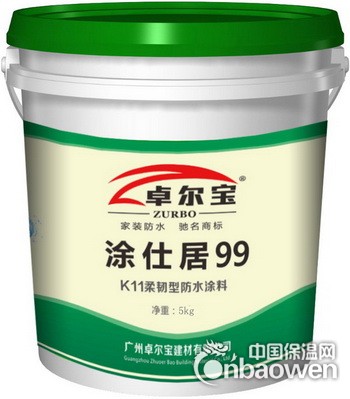 “涂仕居99”柔韧型K11防水涂料是以优质丙烯酸酯等聚合物乳液和水泥为主要原料,加入其它外加剂制得的双组分水性建筑丙烯酸防水涂料,两组分在现场搅拌成均匀、细腻浆料,涂刷于基体表面,固化后可形成柔韧、高强的防水涂膜,该膜对混凝土和水泥砂浆有良好的粘附性,与基面结合牢固,从而达到长久的防水效果。