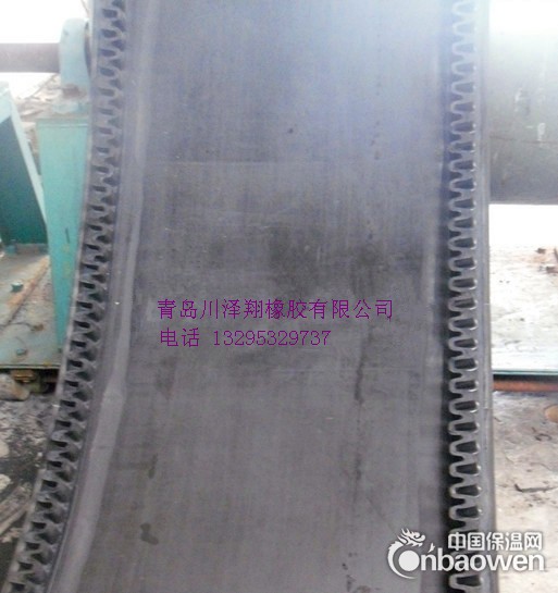 大倾角边输送带又叫裙边隔板输送带, 是由基带、挡边、横隔板3部分组成。挡边起防止物料测滑撒落的作用。为便于绕过滚筒,档边设计成波纹状;横隔板的作用是承托物料,为了实现大倾角输送,采用T型TC型。档边和横隔板是用二次硫化的方法与基带连接的,具有很高的连接强度。用于输送易散落的粉状、粒状、小块状、糊状及液态状物料。其特点:适用于倾角0°~90°散装物料的输送;具有使用范围广、占地面积小、无转运点、减少土建投资、维护费用低、维修容易输送量大连续化、高效率、大倾角运输,操作安全,使用简便,,运费低廉,并能缩短运输距离,降低工程造价,节省人力物力等特点;解决了普通带和花纹带所不能达到的输送角度;还可根据使用环境,设计成完整、独立的输送系统,避免了间断输送和复杂输送的提升系统。可沿水平、倾斜、垂直和变角方向输送各种散装物料,从煤、矿石、沙子到化肥和粮食等。物料粒度不限,可从很小的粒度到400mm的大粒度,输送量可从1立方米/小时到6000立方米/小时。