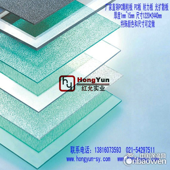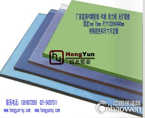 上海红允实业有限公司是专业从事聚碳酸酯(PC polycarbonate)板材,有机玻璃板材的研究开发和生产销售加工一体化的生产型企业,厚度从0.125mm--50mm,颜色有透明,茶色,绿色,特殊颜色可定做,我们与德国拜尔BAYER模克隆Makrolon、美国GE lexan、韩国世化保持着良好的战略合作伙伴关系,致力于为国际、国内大客户提供专业化和个性化服务。专业生产供应PC、PVC、亚克力等各种塑料板材、片材、卷材、薄膜、光扩散板、阻燃板、防静电板、哑光板、颗粒板、磨砂板,PC单双面硬化板。拥有丰富的聚碳酸酯(polycarbonate)PC板加工经验,可以根据客户的设计图纸,选用GE Lexan或BAYER模克隆Makrolon(或其它指定PC板)聚碳酸酯(Polycarbonate)板材,进行切割,钻孔,铣槽,折弯,粘接,印刷,热压定型等加工,保持特定的角度和形状,满足客户的要求。广泛用于机电设备显示面板,防护罩壳,绝缘连接件,出租车安全防护栏,车辆的挡风PC玻璃,建筑PC采光罩,防爆炸PC玻璃. 安全盖板。欢迎有PC防护罩壳加工,PC绝缘连接件加工,PC透明盖板加工,需要的朋友与我们联系,为您提供PC板加工的解决方案。我们拥有先进的生产设备和管理人才,并拥有专业的设计和开发能力,可根据客户需要在最短的时间里开发出最优质的产品。我们将以最真挚的心、最饱满的热情、最高的效率为您提供最满意的服务!愿与各界同仁携手共进,同创辉煌!