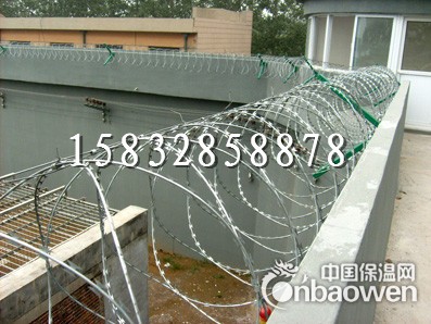 监狱刺网护栏可平地安装,也可在围墙上二次安装,有效防止攀逃。直刺式刺网隔离带,是用柱体和普通刺绳横、纵、斜向交叉绑定成刺网隔离带。主要用于特殊地带、军事基地圈护、沟壕圈护,安装简易,经济耐用。监狱防护网又称监狱护栏网、监狱隔离栅或刀刺围墙网,主要是采用高强度的刀片刺网与普通防护网的结合,由V型支架立拄,加强型焊接片网,安全防盗连接件和刀片刺网组成.刀片刺网是一种新型防护网,由锐利尖角镀锌钢板或不锈钢薄板做刀片,钢丝做芯线组合而成的防护器材。是一种近年发展起来的防护、隔离能力较强的新型防护网产品。它采用钢板冲压成型包附于钢丝(筋丝)之上,由锐利尖角镀锌钢板或不锈钢薄板做刀片,高张力钢丝做芯线组合而成的。锋利的刀型刺由双线扣装后成蛇腹状,既美观又让人不寒而栗。起到了很好的阻吓作用。