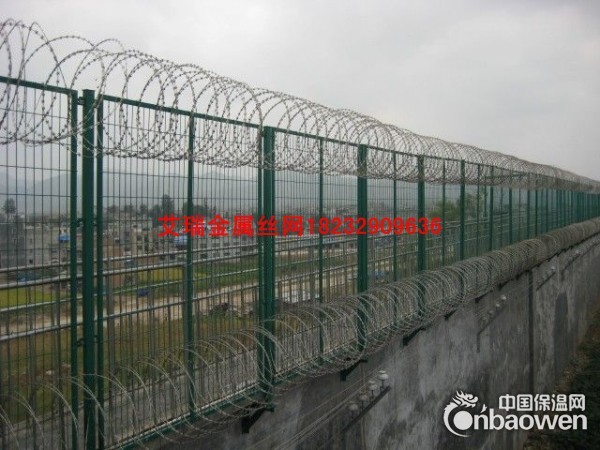 监狱隔离网V型支架加装防拆卸刀刺网。刀刺网的直径一般为500mm、600mm、800mm,材质均为优质304不锈钢,镍含量8个以上。刺网芯线直径为2.5mm、刀片长22mm,刀片宽度15mm,刀片厚度0.5mm。