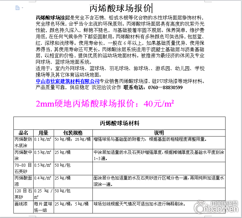 2mm硬地丙烯酸球场报价:40元/m2