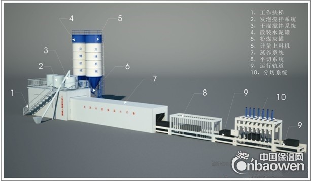(3)大型保温板设备由储料仓、固定式灌注平台、模箱周转平台、自动脱模平台、全自动切割线组成。