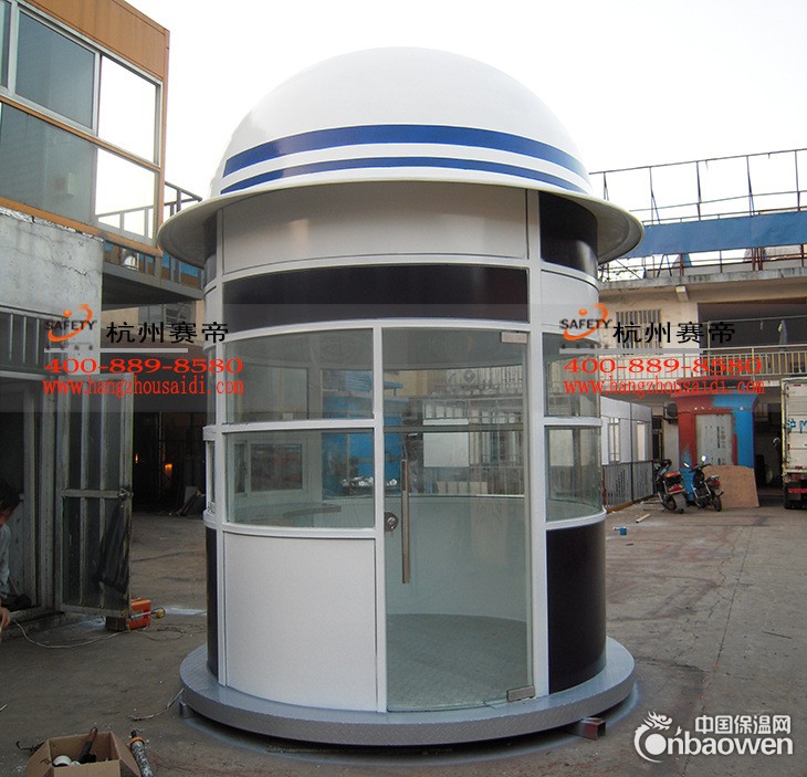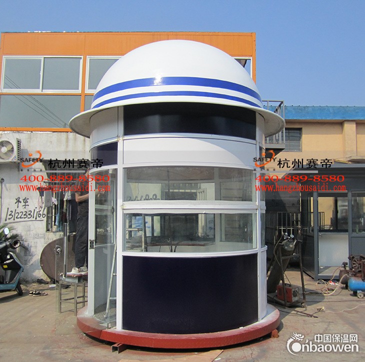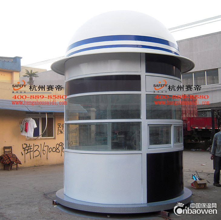 产品说明:本产品为我公司专利产品。在外观造型上,充分体现了警察的形象,标准警蓝色的应用,使人眼前一亮,特别是在岗亭顶部帽子形状的设计,更是值得赞赏,坡形弧度不易积灰尘,通过露水和雨水,可以达到自动清洁的效果、节省了人力物力。
