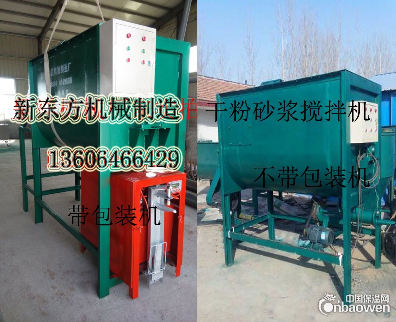 是我厂制造的生产外墙外保温砂浆的简易设备。主要由螺旋加料机,搅拌机,包装机。电器控制箱等组成。该机设计合理,性能优良,1-2人可操作,可用于生产干粉保温砂浆、砂浆王、内外墙腻子粉、粉刷石膏,也可用于生产水泥沙浆及膏状物料的搅拌。具有投资少,占地少,寿命长,操作简单,效益高等优点。