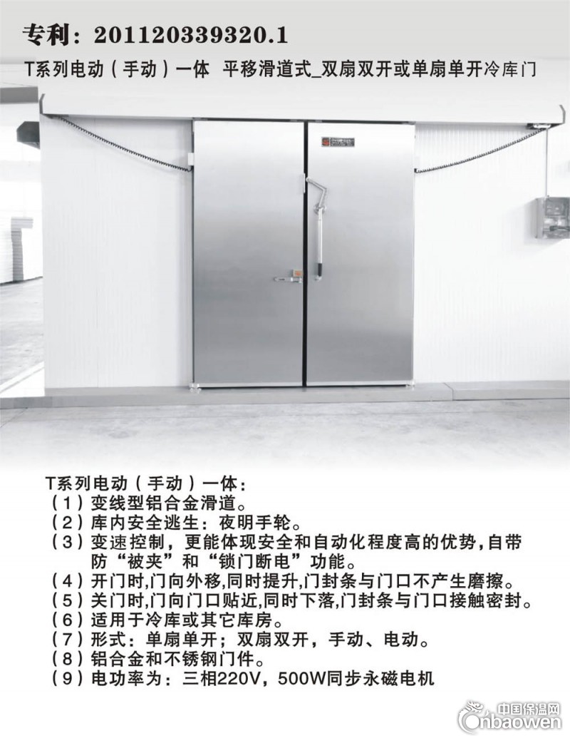 1)电动门选项配置:①红外防夹装置:当有人或车即将出入冷库门洞时,冷库门会不再继续关闭,反而打开,保证人员、车辆及货物的安全,同时也保证了冷库门可以再次使用;②锁门断电装置:当冷库门锁上以后,传动电机即被切断电源,此时若想再次开门,只有把门锁打开,电源方可再次恢复供电,该装置保证了电机传动机构的使用寿命,同时也起到了安全作用。