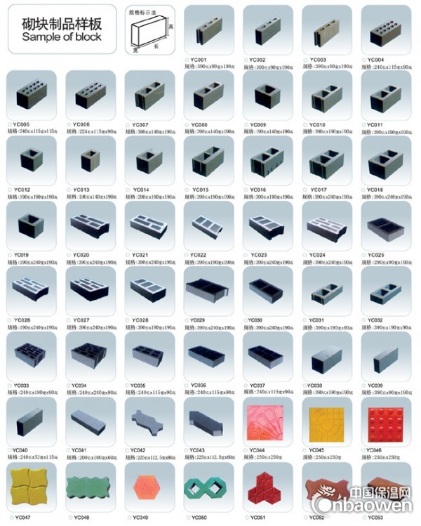七、一机多用通过更换模具可生产不同规格多孔砖、空心砌块、实心砌块、路缘石、路面砖以及植草砖、护坡砖等水泥制品。