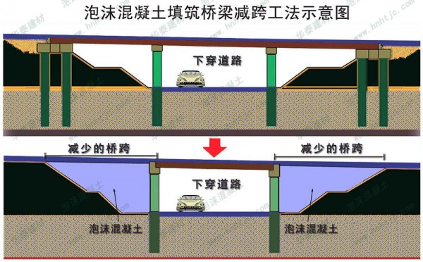 (二) 高桥台台背填筑减少桥跨 当跨越道路的跨线桥较高时,采用气泡混合轻质土填筑桥台台背,固化后对结构物的侧压力极小且可直立填筑,可解决土压力和台前锥坡放坡问 题,将桥台优化为简单的桩柱式桥台并减少因锥坡放坡而增加的桥跨,大幅降低工程造价。