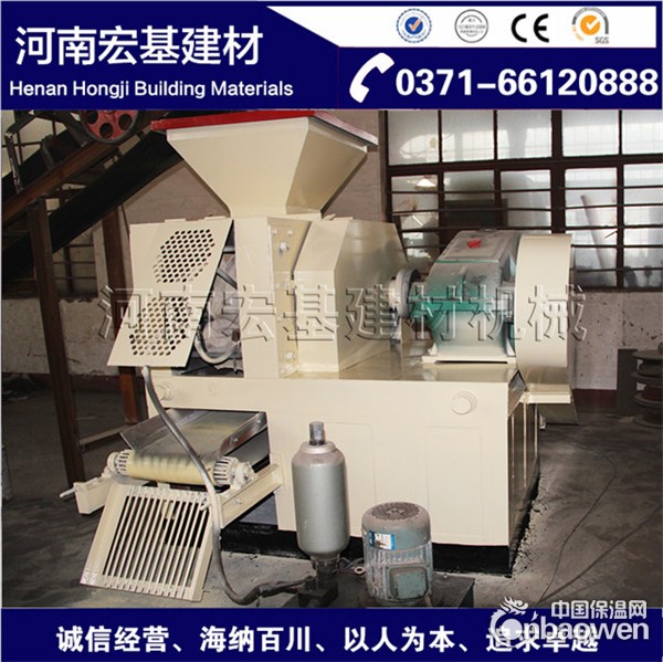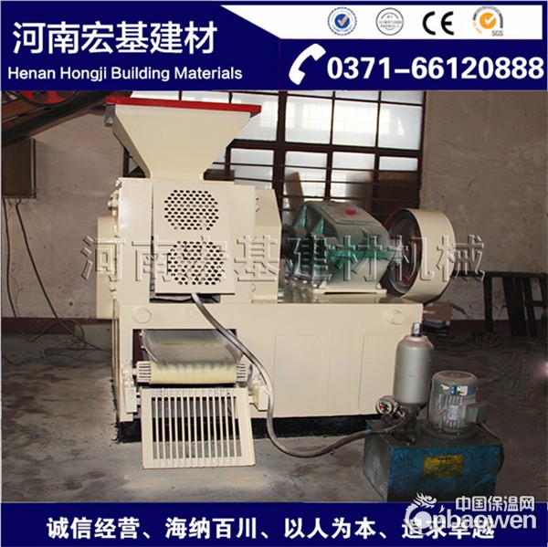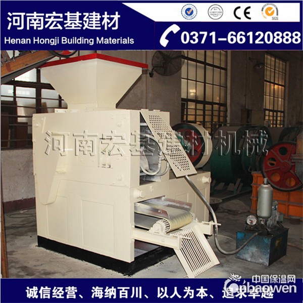 铁粉压球机结构由三部分组成:给料部分;传动部分;成型部分。给料部分主要是实现定量给料来保证物料均匀进入对辊间。螺旋送料装置由电磁调速电机驱动,经皮带轮、蜗杆减速器转动,将被压物料强制压入主进料口。由于电磁调速电机恒矩特性,当螺旋送料机的压料量与主机所需物料量相等时,可以保持恒定的供料压力使球团质量稳定。如供料量过大,则送料装置的电过载;供料量过小则不成球。铁粉压球机传动部分主机由电磁调速电机提供动力,经皮带轮、圆柱齿轮减速机,通过棒销联轴器传至主动轴。主动轴与被动轴通过开式齿轮保证同步运行。被动轴承座后边装有液压装置。液压保护装置是由液压泵将高压油打入液压缸,使活塞产生轴向位移。活塞杆的前接头顶在轴承座上以满足生产压力要求。铁粉压球机成型部分主要指主机部分,核心部分是轧辊。当两压辊之间进料过多或进入金属块时,液压缸活塞杆受压过载,液压泵会停机、蓄能器对压力变化起缓冲作用、溢流阀开启回油、活塞杆移位使压辊间缝隙加大从而使硬物通过压辊,系统压恢复正常,可以保护压辊不损坏。铁粉压球机供料必须满足,宜采用可调速的螺旋给料机,观察回料量调整新料的供给量。供料之前一定要使机器空运转几周以后,在开始填充物料。以防铁粉压球机吃料过多,给减速机和电机造成超负荷,使设备辊轴扭断。