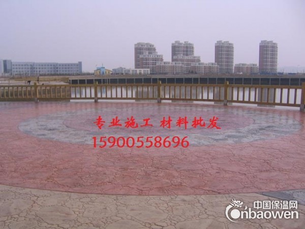 在混凝土初凝阶段,播撒上产品――材料粉末,经必要的工序,使本产品中的有效物质(含特种水泥添加剂)渗入混凝土层(最大渗透力为10cm),与混凝土结合后其承压力增大1.5倍左右,同时在混凝土表面聚合一层坚固的保护层(厚3mm左右)――(注:彩色压模地坪工艺通俗说明)。 工程实践证明,在压模地坪的模板内,按设计布置一定花纹和图案的衬板,待混凝土硬化拆除模板后,便可使压模地坪表面形成立体装饰图案,这是一种施工比较简便、装饰效果良好的装饰手段。
