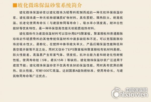玻化微珠保温砂浆是应用于外墙内外保温的一种新型无机保温砂浆材料, 以玻化微珠为轻质骨料、玻化微珠保温胶粉料按一定比例搅拌均匀混合而成,具有强度高、质轻、保温、隔热好、电绝缘性能好、耐磨、耐腐蚀、防辐射等显著特点