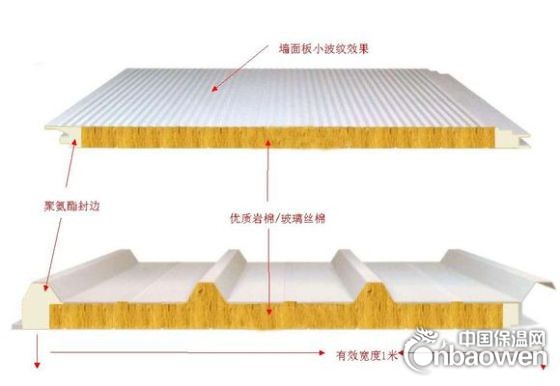聚氨酯封边型岩棉板为中间是结构岩棉,两侧距端部各有50mm宽聚氨酯保温材料,也可以做成全部由岩棉填充的复合板。