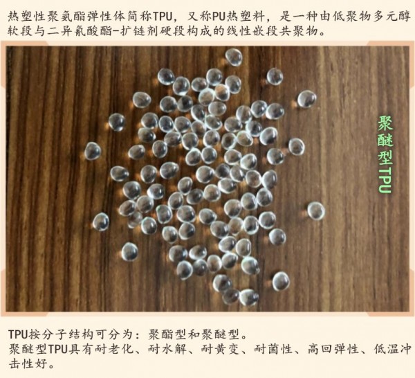 TPU名称为热塑性聚氨酯弹性体橡胶。主要分为有聚酯型和聚醚型之分,
