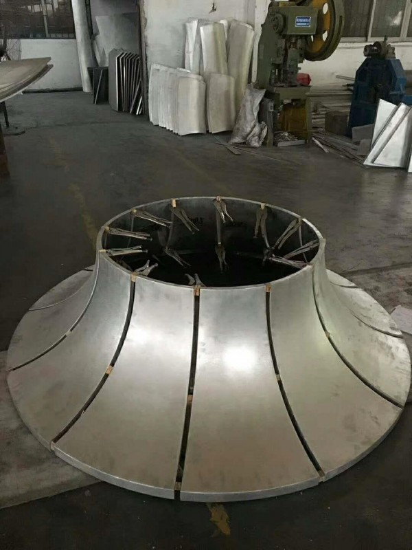 双曲铝单板加工的拉形设备的运动仿真技术可使人们预先看到零件的制造过程,及时发现生产过程中可能出现的轨迹错误、意外碰撞等情况。首先根据组件的数字模型由工艺设计系统计算得到初始模具型面、毛料和拉形轨迹,并将生成的数据导入工艺仿真及优化系统,生成优化的模具型面,其中的毛料数据作为实际备料的依据。