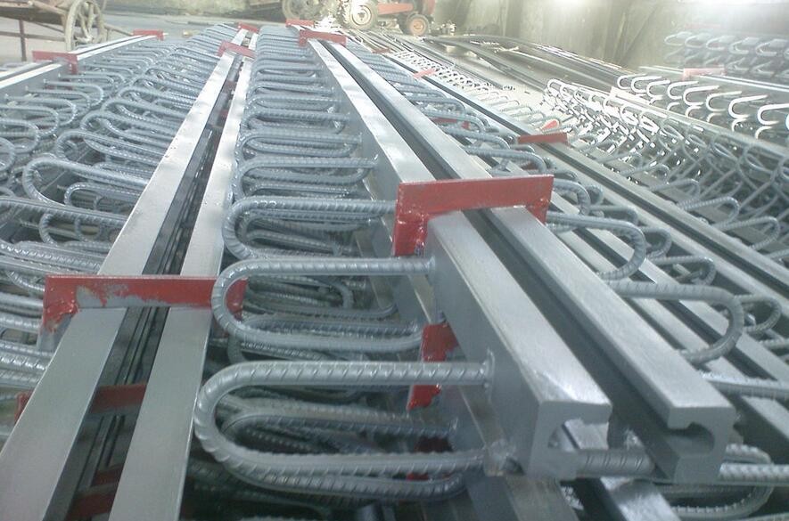 在设置桥梁伸缩缝装置处,栏杆与桥面铺装都要断开。为习气河流方向与行车道路不笔直的桥梁需求,可将锚固钢筋和位移控制箱斜向安置,行将伸缩量为0~80mm的各种伸缩设备及MZL160~1200mm的模数式伸缩设备的锚固钢筋及位移控制箱水平歪斜的焊在异型边梁上