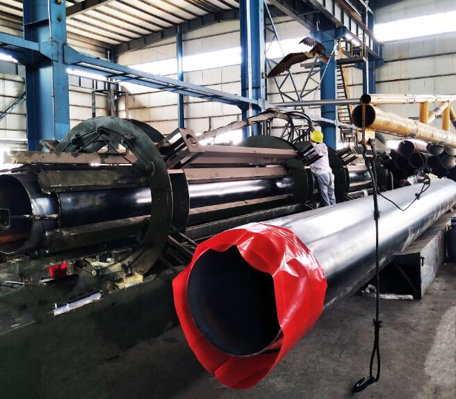 工艺流程 生产工艺流程图 配置——》钢管表面除锈处进——》支架安装——》安装外套管——》封头——》模具安装——》传送发泡工作台——》开注入孔、排气孔——》发泡注入A、B胶——》折除封头——》管端处理——》产品自检——》出厂标志及合格证——》合格产品出厂