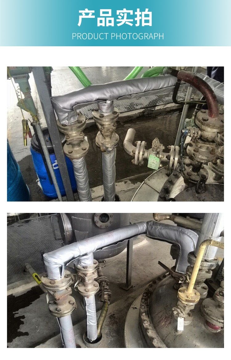 一、主要材料:湖南威耐斯柔性可拆卸保温套(衣)采用耐高低温、防火保温材料;有内衬、中间保温层、外保护层三层组成;根据阀门蒸汽管道或设备的具体形状及其使用,经过精心设计、测绘后,通过特殊工艺制作而成。工作温度在850℃以下,威耐斯科技 管道电伴热保温套 阀门电加热保温衣 新型保温材料。
