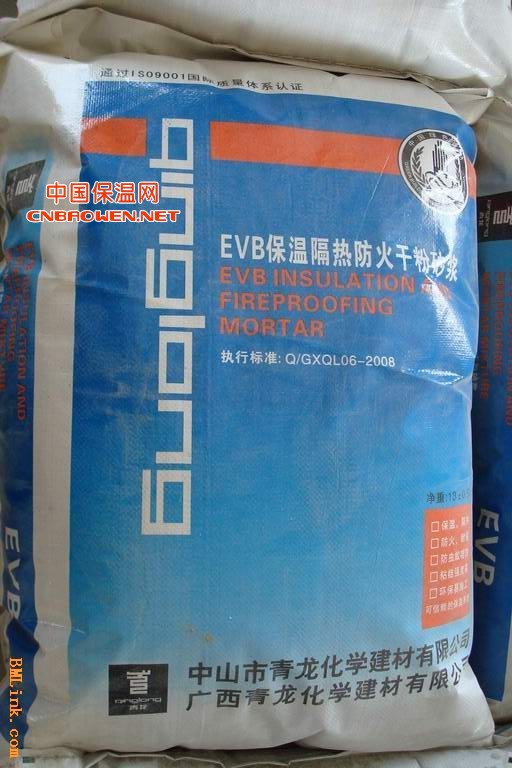 EVB保温砂浆(13878133255朱经理),广西青龙化学建材有限公司投资3000多万元在隆安县开设占地60亩的现代化工厂,引进最先进的保温砂浆生产线,广西唯一一家保温材料生产达到国际标准的ISO9001体系的企业,保证了所有生产出的材料性能的稳定和质量,
