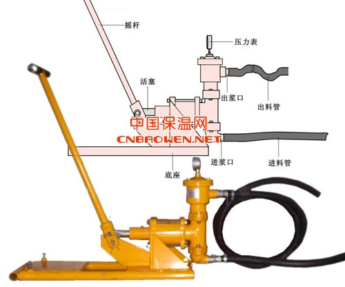 按照说明书将手动摇杆装配好。检查压力表管路内油是否充满,连接好吸料管(下部)和出料管(上部),将吸料管插入料桶,往复摇动摇杆,即可开始灌浆。