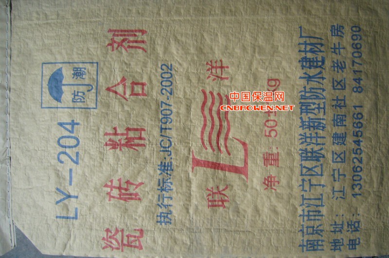 LY—204陶瓷墙地砖粘合剂 (符合JC/T547-94标准) 陶瓷墙地砖粘合剂属A类F级产品,即水泥等无机胶凝材料、矿物集料和有机外 本产品在配料上考虑胶结强度、耐水、耐冻、耐热等耐久性及收缩率变化的要求,同 时又注意到了墙地砖不同材质和施工条件的要求,从而使本产品具有高强、高粘结、 抗渗、低收缩、耐候变和施工率等特点,并按施工要求和季节气候变化凝结速率和粘 稠性能,解决了空鼓、脱壳等传统粘贴存在难题。 本产品经过反复研究和改进,基本上克服了以水泥胶结料为主要组分的产品在 |