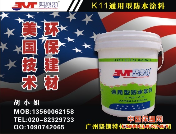 坚美特K11通用型防水涂料是一种双组分聚合物改性水泥防水材料。浆料由进口高聚物添加各种助剂化合而成,具有高粘结力、柔韧性,以及防霉、耐磨性能;粉料由优质水泥、石英砂及独特的活性物质组成,遇水之后,发生化学反应,渗进结构体内部,并形成结晶体,不仅阻遏各方向的水通过,而且加固了结构体,延长其寿命。
