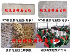白乳胶再生胶(90%),也称之为天然乳胶再生胶-白色乳胶再生胶-乳胶再生胶:主要原料为马来西亚进口废避孕套、橡胶树的废胶杯,橡胶丝等经过破碎、脱硫、消毒、烘干、过滤、挤出等工艺制作完成。白乳胶再生胶具有易配色、无杂质、环保无味道、手感弹性好、扯断伸长率高等特点,可单独使用90%乳胶再生胶生产浅色汽车内外胎、输送带、运动鞋底、电缆、胶板、胶管、球胆、胶带等各种浅白色、彩色橡胶制品,也可与天然胶并用。挤出橡胶制品或模压橡胶制品均可使用。在保证产品质量的同时极大的降低橡胶制品的生产成本,具有省工、省电、开炼工艺简单的优点,本品无须塑炼,加入化工原料后停放12至24小时后使用效果最佳。河北鸿运再生胶厂免费提供使用白乳胶再生胶技术支持或配方调整。SYS
