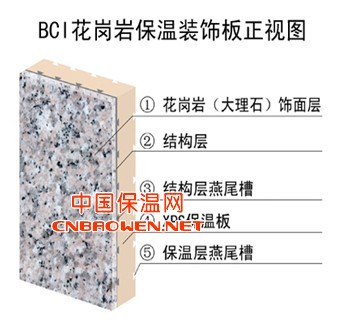 BCI花岗岩保温装饰板是工厂预制成型的板状材料,由保温材料、花岗岩石板或大理石板或陶瓷砖面板复合而成具有保温和装饰功能,其保温材料为挤塑聚苯板(XPS)或无机保温板。