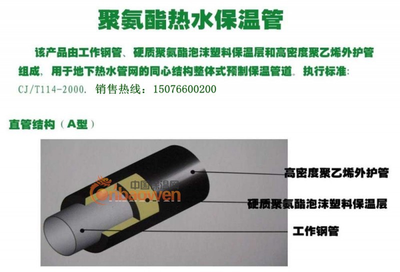 保温层材料为密度60kg/m3_80kg/m3的硬质聚氨酯泡沫,充分添满钢管与套管之间的间隙,并具有一定的粘接强度,使钢管、外套管及保温层三者之间形成一个牢固的整体。