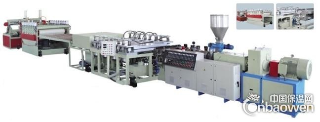 机组由双螺杆塑料挤出机、自动真空上料机、除湿烘干混料机、板材机头、加热校平装置、排辊托冷装置、裁边装置、牵引机、剪切机、排辊输送机等组成。