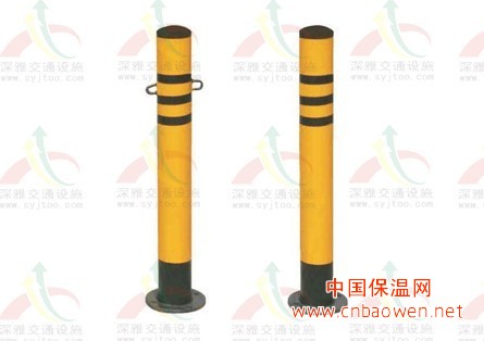 由钢管与法兰盘组成,钢管外贴黄黑反光膜,起到反光警示作用。配有锁芯的立柱,使得在需要的时候可打开锁具,将立柱提起并移动在任何合适的地点,供车辆通行。在交通完毕之后即可将立柱重新置于底座上,上锁后即可避免其他车辆对于自有车位的侵占。可以在车库前、或者其他认为重要的场合前设置,起到保护好车库大门、避免暴力破坏的作用。