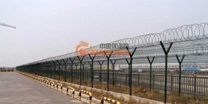 机场围界又称作“Y型安全防御护网”,是由V型支架立柱,加强型焊接片网,安全防盗连接件和热镀锌刀片刺笼组成强度和安全防御性级别很高。近年来,被广泛应用在机场,军事基地等高安全场所。注:如果在机场围界顶部加装刀片刺丝、刀片刺绳后又很好的增强了安全防护性能。