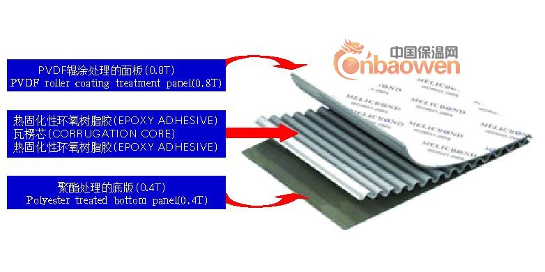 常州双欧板业有限公司生产的铝瓦楞板年产量30万㎡米,产品有:纳米自洁铝瓦楞板,氟碳PVDF铝瓦楞板,花纹铝瓦楞板、异形铝瓦楞板、外墙铝瓦楞板、内墙铝瓦楞板、冲孔铝瓦楞板、双曲弯圆铝瓦楞板、宽幅铝瓦楞板、隔音铝瓦楞板、造型铝瓦楞板等各种中、高档铝瓦楞板。采用进口氟碳涂料:荷兰阿克苏、韩国KCC、美国PPG、嘉士伯等品牌涂料。优质高强度铝合金板材:西南铝、瑞闽铝等品牌。常用厚度规格有1.5mm, 2.0mm, 2.5mm, 3.0mm, 3.5mm 及 4.0mm.,单件成型铝板最大尺寸可达1600x7000mm。其构造主要由面板、加强筋和角码组成。角码可直接由面板折弯、冲压成型,也可在面板的小边上铆装角码成型。加强筋与板面后的电焊螺钉连接,使之成为一个牢固的整体,极大增强了铝瓦楞板幕墙的强度与刚性,保证了长期使用中的平整度及抗风抗震能力。如果需要隔音保温,可在铝板内侧安装高效的隔音保温材料。