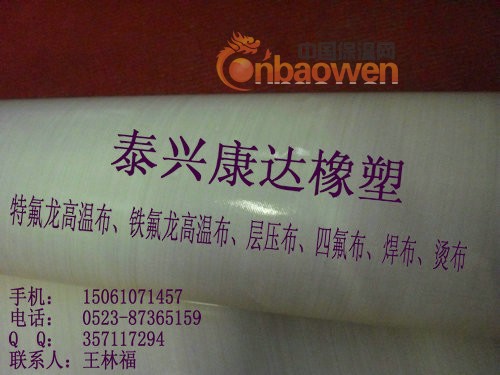 泰兴康达橡塑(0523-87365159)专业生产特氟龙高温布,特氟龙高温布学名聚四氟乙烯涂覆玻璃纤维布,又称特氟龙耐高温漆布,是以悬浮聚四氟乙烯(俗称塑料王)乳液为原料,浸渍高性能玻璃纤维布而成。是一种高性能,多用途的复合材料新产品。因其优异的各项性能,故被广泛应用在航空、造纸、食品、环保、印染、服装、化工、玻璃、医药、电子、绝缘、建筑(棚顶膜结构基布)、砂轮切片、机械等领域。