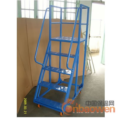 一面设有台阶(台阶旁边有扶手)供使用者登上平台,平台另三面配有护栏保证作业者的安全。平台作业面一般大小可容纳1-2人站立、转身、移动。使用者可在登高车的平台上完成从货架等高处堆取物品等动作。另外,登高车配有脚轮,可供使用者推拉转向移动,方便快捷。其中有前脚轮上配备有轮刹,刹住后,登高车固定不可移动,使用者可安全放心的登高操作。产品适用范围:广泛用于机械、石油、化工、医药、电子、档案、航空、码头、铁路、汽车、建材超市等行业。